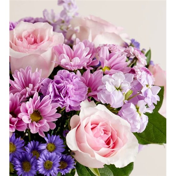 EXCLUSIVE Just like a daydream. Our delightful lavender bouquet is gathered with accents of pink and lush greenery in a glass vase tied with a lavender satin ribbon that complements the delicate beauty of the blooms.