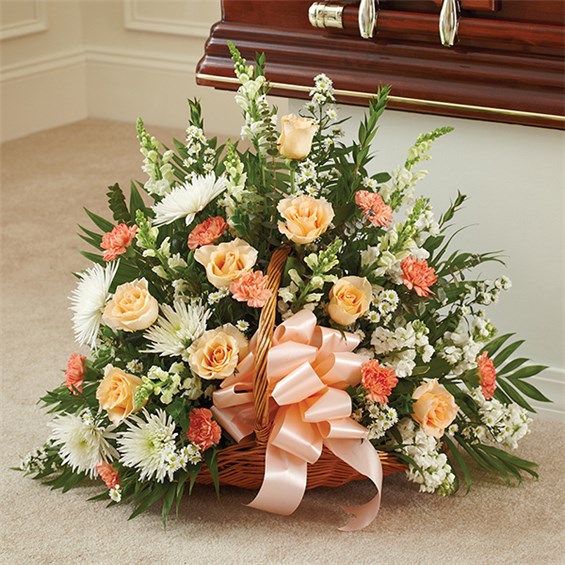 They drew people in with their warm smile and exuberant spirit. These are the qualities we remember most, the ones we want to honor. Our fireside basket arrangement, hand-designed by expert florists with a splay of peach, orange and white blooms, captures this thoughtful sentiment in a grand display, beautifully suited for the funeral or gravesite. 26"H X 32"L